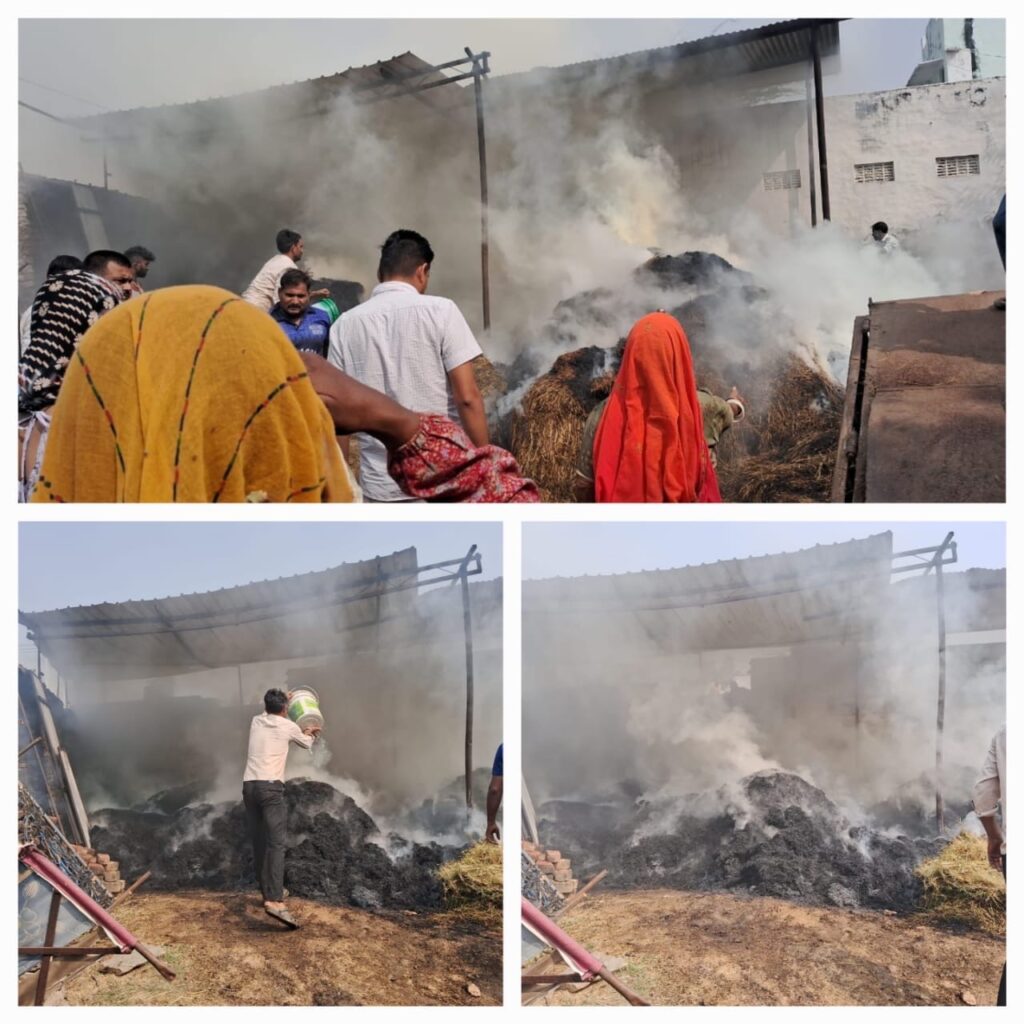 अजमेर। नसीराबाद के निकटवर्ती ग्राम देरांठू के ढाबा मौहल्ला स्थित गजमल जाट के बाड़े में अचानक आग लग गई। आग की लपटें देख ग्रामीण तुरन्त घरों से पानी ला लाकर आग पर काबू पाया। वहीं दमकल को सूचना करने पर समय पर दमकल नहीं पहुंची। आग से किसान की बाड़े में रखी कई ट्राली चारा जलकर राख हो गया। ग्रामीणों ने मौके पर पहुंच कर आग पर काबू पाया अन्यथा अन्य पास में बने बाड़े भी आग की चपेट में आ सकते थे । इस बार ज्यादा बारिश के कारण किसानों के इस बार चारा नहीं के बराबर हुआ है। वहीं बाड़े में रखे चारे में आग लगने से किसान के दोहरी मार पड़ गई है। ग्रामीणों ने प्रशासन से ग्रामीण किसान को हुई हानि का उचित मुआवजा दिलवाने की मांग की है।