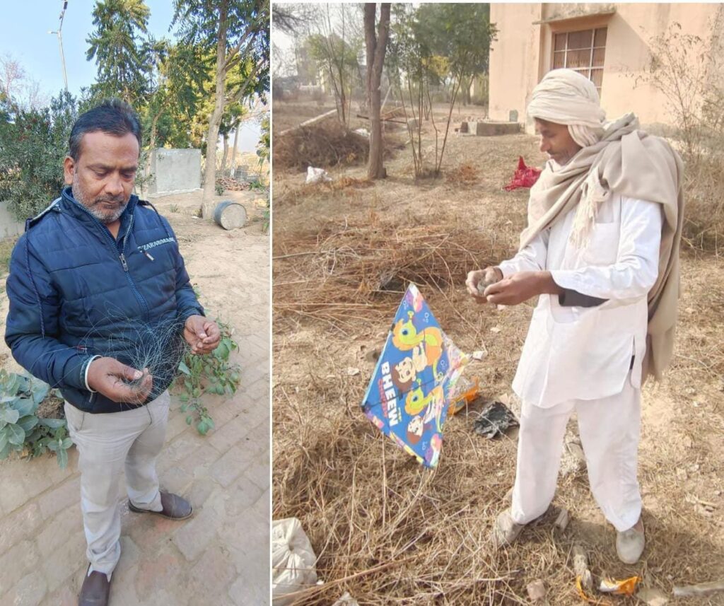 फोटो- राष्ट्रीय पक्षी मोर संरक्षित क्षेत्र भादरा में पतंगबाजी के दौरान आकर गिरा धारदार मांझा समेटते कार्यकर्ता सुनील बंसल व ओमप्रकाश