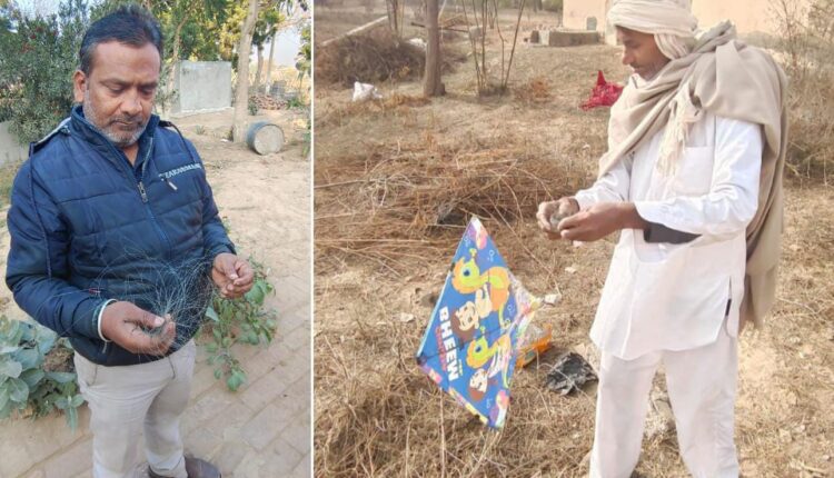 फोटो- राष्ट्रीय पक्षी मोर संरक्षित क्षेत्र भादरा में पतंगबाजी के दौरान आकर गिरा धारदार मांझा समेटते कार्यकर्ता सुनील बंसल व ओमप्रकाश