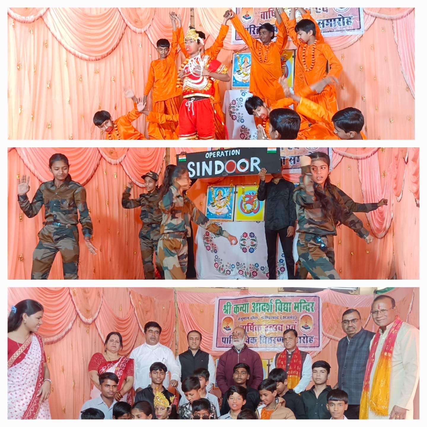 अजमेर। श्रीकन्या आदर्श विद्या मंदिर हनुमानचौक नसीराबाद में शनिवार को वार्षिकोत्सव एवं पारितोषिक वितरण समारोह हर्षोल्लास से मनाया गया। इस अवसर पर कार्यक्रम के अध्यक्ष प्रदीप सिंघल-व्यवसायी, मेम्बर-रोटरी क्लब नसीराबाद, मुख्य अतिथि महेंद्र पथरिया-व्यवसायी, भाजपा महामंत्री नसीराबाद, विशिष्ट अतिथि महेश मेहरा- एडवोकेट, भाजपा मंडल अध्यक्ष नसीराबाद रहे। वार्षिकोत्सव में भैया-बहिनों द्वारा ऑपरेशन सिंदूर, हनुमान चालीसा, बेटी की व्यथा, वृद्धाश्रम व्यवस्था आदि के साथ अन्य रंगारंग कार्यक्रम प्रस्तुत किये गए। पुरातन भैया-बहिनों द्वारा मातृ-पितृ पूजन किया गया। विद्या भारती चित्तौड़ प्रान्त व जिले की विभिन्न प्रतियोगिताओं में भाग लेने वाले सभी भैया-बहिनों के साथ सभी आचार्यो का अभिनंदन किया गया। समारोह में भाग लेने वाले सभी भैया-बहिनों को उपहार दिए गए। समारोह में विद्या भारती जिला संस्कार केंद्र प्रमुख संग्राम सिंह , सत्यनारायण राठी -व्यवसायी, अंकित अग्रवाल-खंड कार्यवाह नसीराबाद, विद्यालय समिति अध्यक्ष ताराचन्द प्रजापति, उपाध्यक्ष सुनील वर्मा, सचिव श्रीमती निवेदिता , कोषाध्यक्ष सुभाष मित्तल, आदर्श विद्या मंदिर देराठू के प्रधानाचार्य राजेश कुमार उपस्थित रहे। अतिथि परिचय व स्वागत प्रधानाचार्य बृजेश कुमार मुदगल के द्वारा व आभार ज्ञापन विद्यालय सह सचिव कुणाल बंसल द्वारा किया गया। कार्यक्रम का संचालन वरिष्ठ आचार्या श्रीमती सीमा धाभाई द्वारा किया गया। सभी अभिभावकों को अल्पाहार करवाया गया। शांति मंत्र के उपरांत समारोह समाप्त किया गया।
