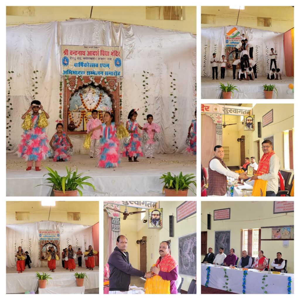 अजमेर। नसीराबाद के देरांठू रोड स्थित श्री चंद्रनाथ आदर्श विद्या मंदिर माध्यमिक विद्यालय में वार्षिकोत्सव हर्षोल्लास से मनाया गया। कार्यक्रम के मुख्य अतिथि रामलाल सिंघल नगर संघचालक, विशिष्ट अतिथि अमित ऐरन, नितिन सिंघल, प्रतिक सिंघल व जिला सचिव संजय शर्मा और विद्यालय सचिव मधु दीदी उपस्थित रहे । कार्यक्रम की शुरुआत दीप मंत्र के साथ हुई, जिसमें सभी भैया बहनों ने विभिन्न सांस्कृतिक प्रस्तुतियां दी । जिसमें स्वागत नृत्य, अंग्रेजी भाषण,संस्कृत भाषण, संस्कृत गीत, नशा मुक्ति और ऑपरेशन सिंदूर पर नाटक रहे। कार्यक्रम मे बडी संख्या मे उपस्थित अभिभावको ने नशा मुक्ति पर हुए एकांकी व ऑपरेशन सिंदूर पर कार्यक्रम की मुक्त कण्ठ से प्रशंसा की । कार्यक्रम सराहनीय होने पर विद्यालय मे कार्यरत आचार्य/दीदी का भी उत्कृष्ट कार्य करने के लिए सम्मान किया गया । कार्यक्रम के मुख्य वक्ता जिला सचिव संजय शर्मा के द्वारा भैया बहनों को भगवान श्री राम के जीवन के बारे में बताया गया । कार्यक्रम के विशिष्ट अतिथि अमित ऐरन ने विद्यालय जीवन के अपने अनुभव साझा करते हुए एक संस्कारी बालक के गुणो की चर्चा करते हुए तथा उन्हे पर जीवन मे अपनाने का आग्रह किया। सभी भैया बहनों को आए हुए अतिथियों के द्वारा पारितोषिक दिया गया व कार्यक्रम के अंत में विद्यालय के प्रधानाचार्य राजेश कुमार घुस्सर द्वारा धन्यवाद व आभार प्रकट किया गया ।