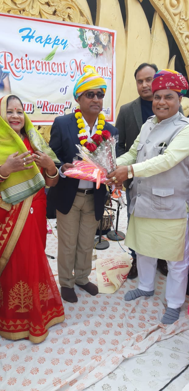 अलवर स्वरूप विलास पैलेस होटल मे आज डॉक्टर जी एस नरूका पार्षद नगर पालिका गोविंदगढ़ प्रभारी एवं जिला महामंत्री जिला कांग्रेस कमेटी अलवर प्रभारी राजस्थान प्रदेश कांग्रेस सेवादल दल जगत अध्यक्ष श्री राजपूत सभा तहसील गोविंदगढ़ अलवर ने कवि रामचरण राग हिंदी लेक्चरर दिल्ली सरकार से सम्मानजनक सेवानिवृत्त होने पर किया भव्य स्वागत साफा बंधन कर पुष्प गुलदस्ता भेंट कर किया सम्मान धर्मपत्नी सहित काफी संख्या में अलवर शहर और जिले के गणमान्य नागरिकों ने भी सेवानिवृत्ति पर रामचरण राग का साफा बांधकर माला पहना कर किया स्वागत