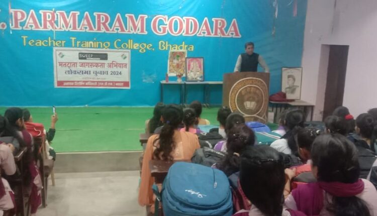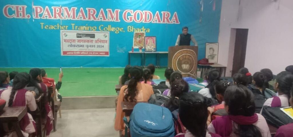 भादरा, 15 मार्च / लोकसभा आम चुनाव 2024 के दृष्टिगत स्वीप गतिविधि अंतर्गत मतदाता जागरूकता कार्यक्रम के तहत शुक्रवार को चौधरी परमाराम गोदारा शिक्षक प्रशिक्षण महाविद्यालय में अध्ययनरत विद्यार्थियों को मतदान के प्रति जागरूक करने हेतु संकल्प पत्र भरवाने के लिए प्रेरित किया गया व संकल्प पत्र भरवा कर विद्यार्थियों से अभिभावको द्वारा भी संकल्प पत्र भरवाए जाने की अपील की गई।साथ ही निर्वाचन आयोग के वीएचए,सीविजिल और सक्षम आदि विभिन्न ऐप्स के बारे में विस्तार से बताया गया और स्वीप टीम से सुरेन्द्र बेनीवाल ने नैतिक मतदान की शपथ दिलवाई।महाविद्यालय प्राचार्य डॉ.धर्मपाल देहड़ू ने मतदान के महत्व पर प्रकाश डालते हुए शत प्रतिशत मतदान करने की अपील की।इस मौके पर कृष्णा सहारण,डॉ.प्रीति शर्मा,प्रीति बाला,दीपिका,सरोज शर्मा ,सरोज कुमारी,अनिता,रेखा स्वामी,सुमन ढाका और बाबर खान आदि महाविद्यालय स्टाफ उपस्थित रहा।मंच संचालन डॉ.प्रीति शर्मा ने किया। फोटो- महाविद्यालय में जानकारी देते स्वीप टीम के सुरेंद्र बेनीवाल
