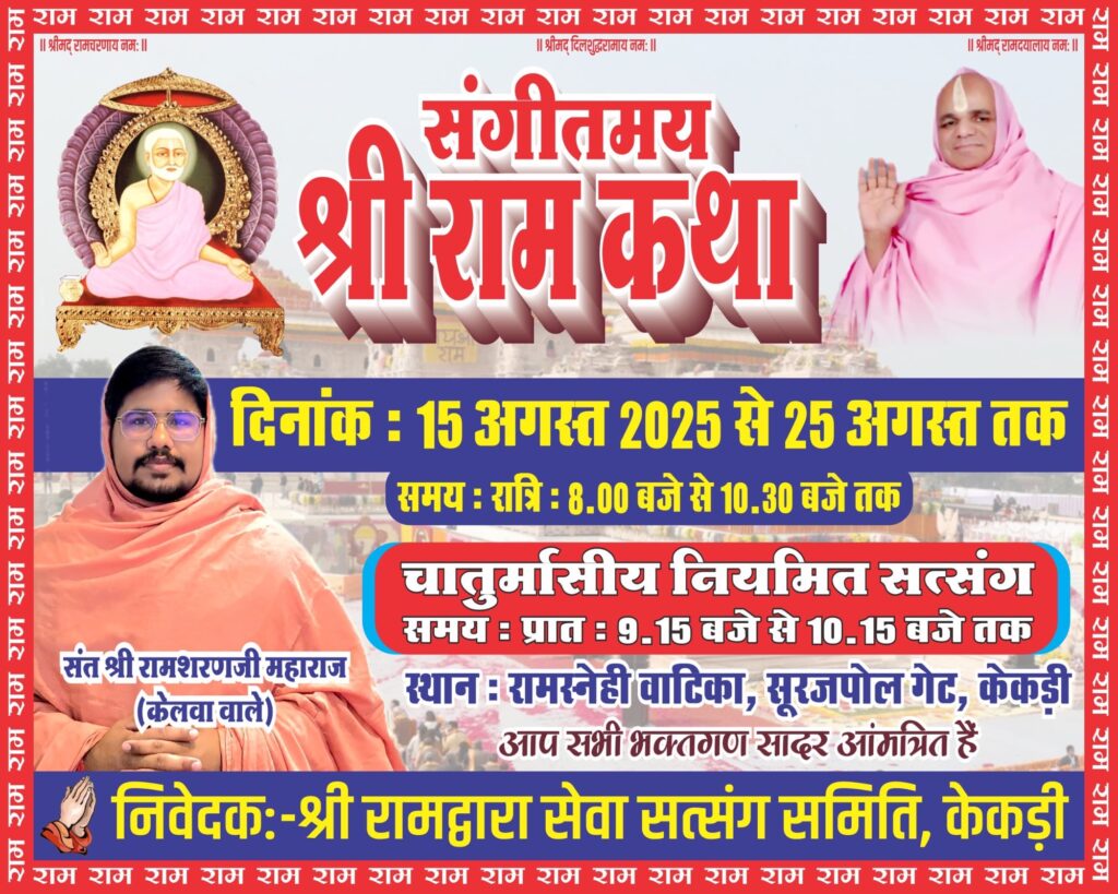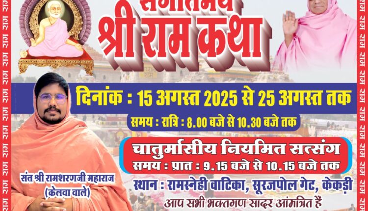 अजमेर। केकड़ी नगर में भक्ति, भजन और आध्यात्मिक ऊर्जा से सराबोर करने वाला भव्य आयोजन आगामी 15 अगस्त से शुरू होने जा रहा है। पुरानी केकड़ी सूरजपोल गेट के बाहर स्थित रामस्नेही वाटिका में 15 अगस्त से 25 अगस्त तक संगीतमय श्रीरामकथा का आयोजन होगा। श्री रामद्वारा चातुर्मास सत्संग समिति के व्यवस्थापक रामगोपाल सैनी ने बताया कि मधुर वाणी के प्रखर वक्ता संत श्री रामशरण महाराज (केलवा वाले) के मुखारविंद से प्रतिदिन रात्रि 8 बजे से 10:30 बजे तक कथा का वाचन होगा।