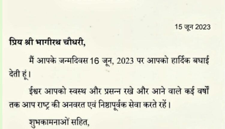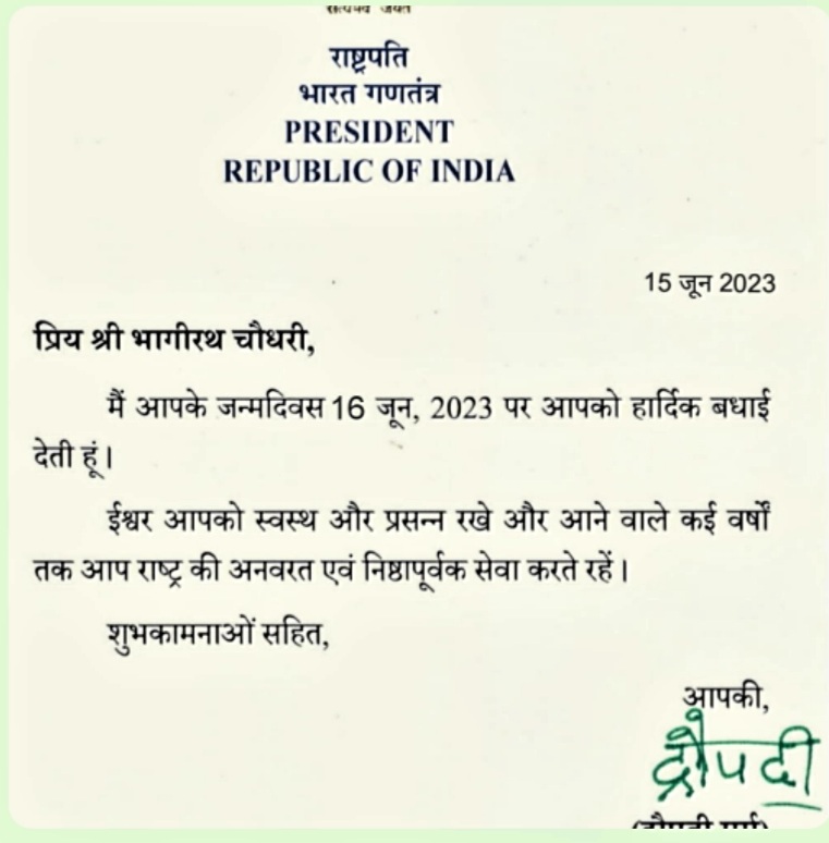 महामहिम राष्ट्रपति द्रोपदी मुर्मू ने अजमेर के लोकप्रिय सांसद भागीरथ चौधरी को दी जन्मदिन की शुभकामनाएं