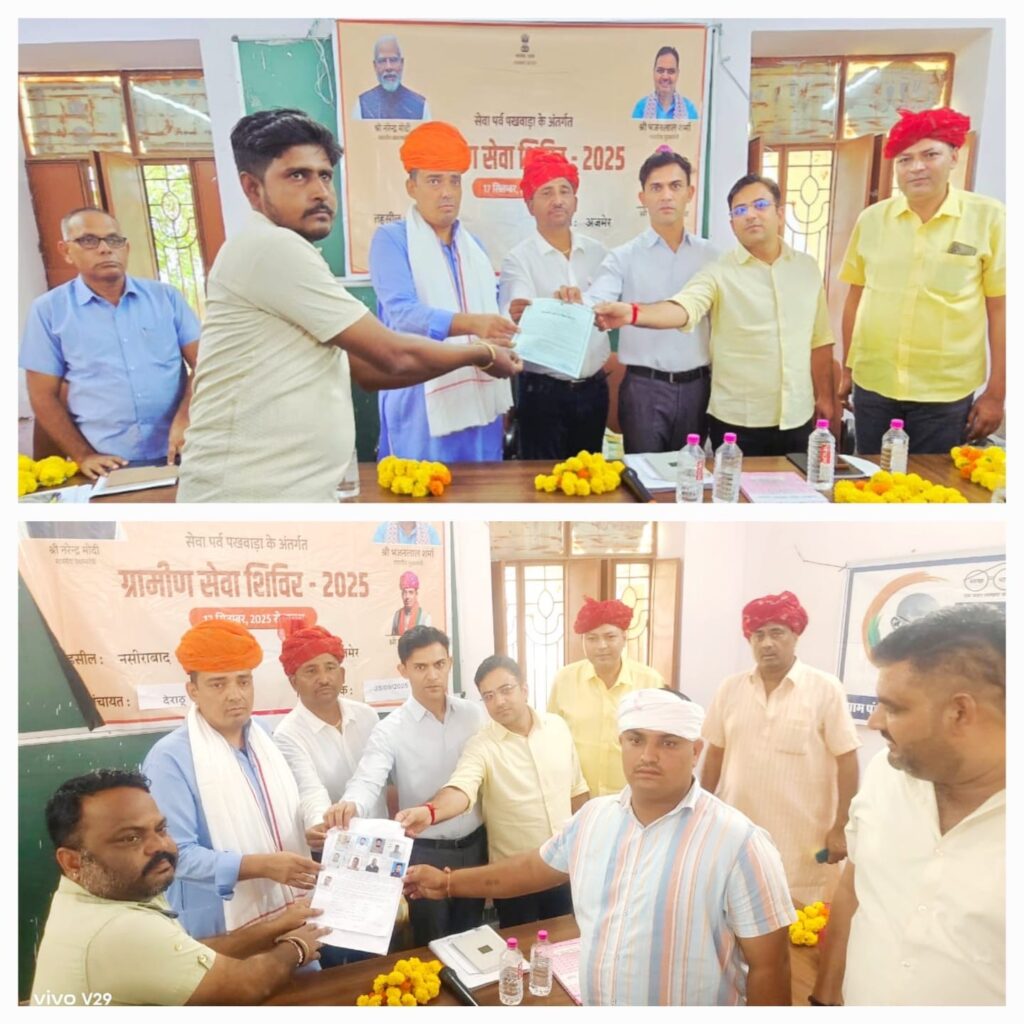 अजमेर। नसीराबाद उपखण्ड क्षेत्र के देरांठू ग्राम पंचायत मुख्यालय मे सेवा पर्व पखवाड़ा के अन्तर्गत आमजन की समस्याओं का निस्तारण के लिए गुरुवार को शिविर आयोजित किया गया। शिविर में नसीराबाद विधायक रामस्वरुप लांबा, उपखंड अधिकारी देवीलाल यादव, तहसीलदार नानूलाल यादव, उप तहसीलदार अजयपाल, पंचायत समिति श्रीनगर विकास अधिकारी महेश चौधरी, सहायक विकास अधिकारी मनोज मौर्य, ग्राम विकास अधिकारी लेखराज रावत, गिरदावर माया चौधरी, पटवारी धर्मेन्द्र सेवर, नरेगा रोजगार सहायक राजेन्द्र सिंह राठौड़ , उपस्वास्थ्य केन्द्र से एएमएन इन्द्र पाल कौर सहित विभागाध्यक्ष मौजूद रहे। उपखंड अधिकारी यादव एंव तहसीलदार ने विभागाध्यक्षों से चर्चा करते हुए अधिक से अधिक किसानों, ग्रामीणों को राज्य सरकार की जनकल्याणकारी योजनाओं से लाभाविंत करने के निर्देश दिए। शिविर में मिठू लाल प्रजापत पुत्र नोरतमल प्रजापत ने अपने पुराने आवासिय घर का पट्टा विलेख जारी करवाने हेतु प्रार्थना पत्र प्रस्तुत किया। जिस पर शीघ्र कार्यवाही करते हुए मौके पर ही परिवारिक विवाद को समझाइश करके पुराने मकान का आवासीय पट्टा शिविर में प्रदान किया गया। जिससे लाभाविंत परिवार बहुत खुश नजर आया एंव लाभार्थी ने उपस्थित सभी अधिकारियों को धन्यवाद दिया। इसके साथ ही ग्रामीणों को 20 पट्टे भी प्रदान किए गये। शिविर में राजस्व विभाग से 25 नामांतरण, 3 बटवांरा, 24 शुद्धिकरण के प्रकरण प्राप्त हुए। जिनका शिविर में ही हाथों हाथ निस्तारण किया गया। इसके साथ पी एम किसान निधि, रजिस्ट्री फार्मा, मूल निवास प्रमाण पत्र, जाति प्रमाण पत्र आदि कार्य शिविर में निबटायें गये। रसद विभाग से सोनू जैन ने राशन सामग्री के लिए ग्रामीणों की केवाईसी की । शिविर में सहकारी समिति अध्यक्ष दिनेश चौधरी, वार्ड पंच चैन सिंह राठौड़ सहित आंगनबाड़ी कार्यकर्ता एंव सहायिकाओं में सुमित्रा दाधीच, विष्णु वैष्णव, सुशीला दाधीच, विनिता वैष्णव, दौलत कंवर , कान्ता राव , विष्णु देवी जाट ने सहयोग प्रदान किया ।