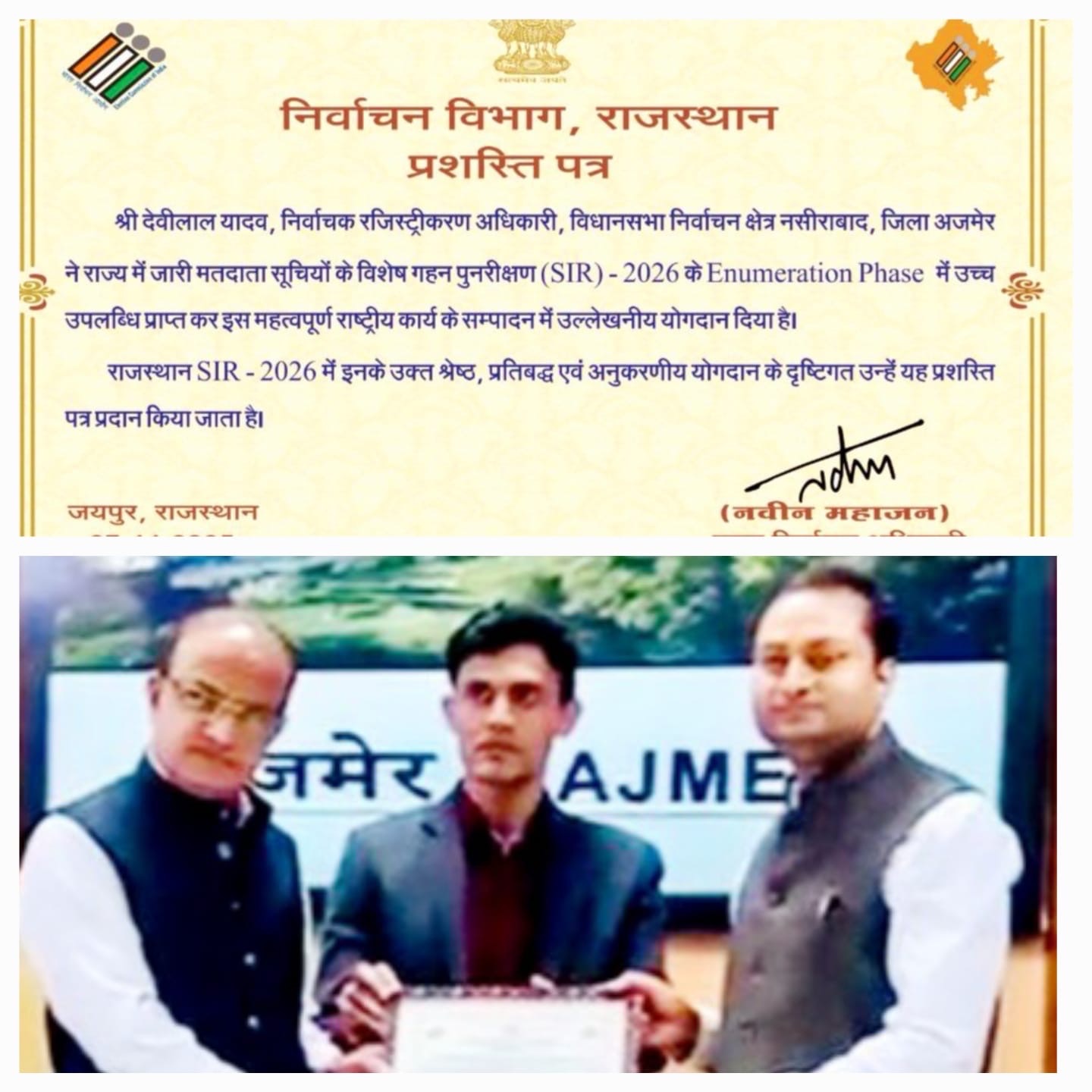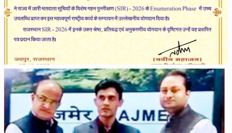 अजमेर। नसीराबाद उपखण्ड अधिकारी एवं ईआरओ देवीलाल यादव को विशेष गहन पुनरीक्षण-2026 के तहत उत्कृष्ट कार्य करने के लिए मुख्य निर्वाचन अधिकारी, राजस्थान नवीन महाजन ने वीसी के द्वारा एनआईसी अजमेर पर सम्भागीय आयुक्त शक्ति सिंह राठौड़ एवं जिला निर्वाचन अधिकारी लोकबन्धु के सानिध्य में प्रशस्ति पत्र प्रदान किया।