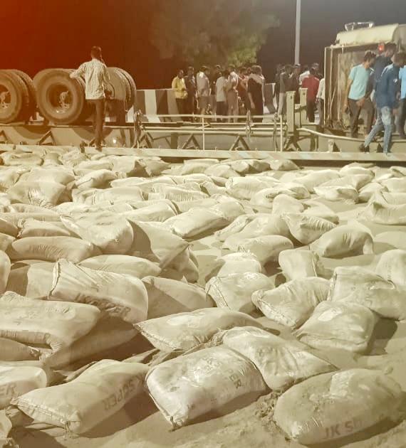 राष्ट्रीय राजमार्ग भीलवाड़ा जयपुर के झडवासा पुलिया पर सिमिन्ट के कटटो से भरा टेलर खाया पलटी