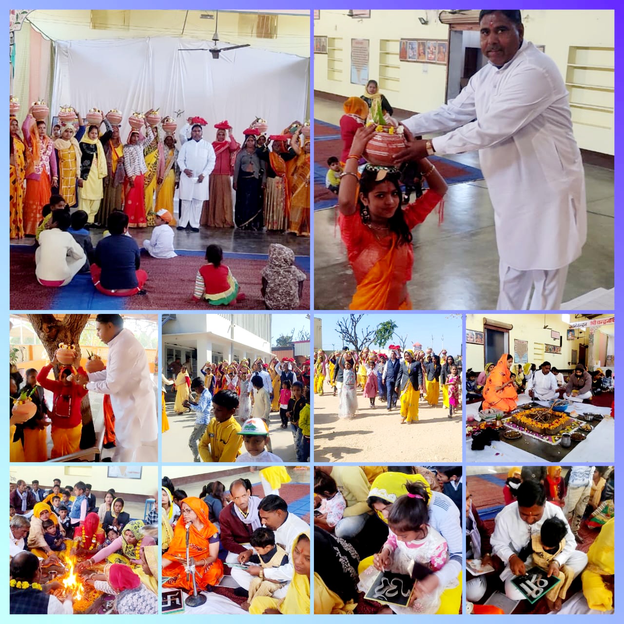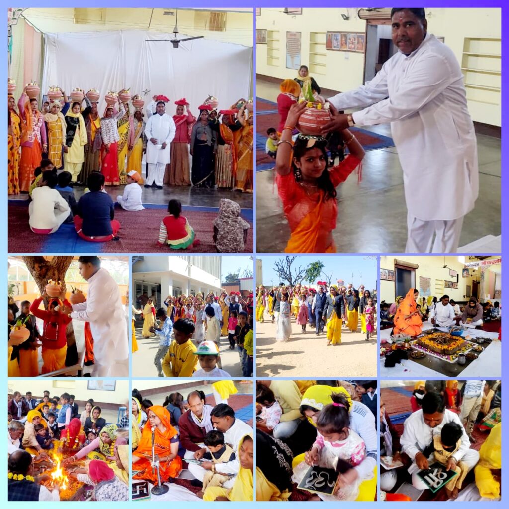समाधि से विद्यालय तक कलश यात्रा निकाली गई। कलश यात्रा समापन पर विद्यालय परिसर मे श्रीमती सुषमा शर्मा व प्रधानाचार्य लादूराम सीरवी द्वारा गायत्री मंत्र के साथ हवन कराया गया। हवन सहयोग मे विद्यालय के आचार्य मुकेश कुमार हिन्डुनिया, द्वारिका प्रसाद आर्य, मोहन लाल खींची, ज्योति पथरिया,सन्तोष सैनी,दर्शना सैनी,सन्जु सैनी, सुनिता मौर्य, वर्षा जैसवार आदि उपस्थित थे। कार्यक्रम मे 21 भैया-बहिनो का पाटी पूजन किया गया। पूजन मे भैया बहिनो से पट्टी पर ओम,स्वास्तिक तथा श्री लिखाकर शिक्षा के लिए प्रेरित किया।विद्यालय के प्रधानाचार्य लादूराम सीरवी ने बसंत पंचमी पर विद्यारम्भ संस्कार के महत्व एवं वर्तमान प्रासंगिकता पर विषय स्पष्ट करते हुए बाहर से आए सभी अतिथियों व अभिभावको का आभार व्यक्त किया। अंत मे महा आरती के पश्चात प्रसाद वितरण कर कार्यक्रम का समापन किया।