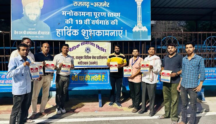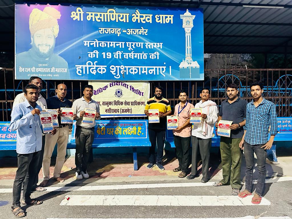 अजमेर । जिला विधिक सेवा प्राधिकरण अजमेर सचिव रामपाल जाट ( अपर जिला एवं सेशन न्यायाधीश अजमेर) के आदेशानुसार तालुका नसीराबाद के पीएलवी भरत प्रजापत ने 31मई को ग्राम पंचायत राजगढ़ में विधिक जागरूकता शिविर का आयोजन किया गया ।शिविर मे श्री मसाणिया भैरव धाम राजगढ़ भैरव धाम के मुख्य उपासक चंपालाल महाराज द्वारा ग्राम वासियों को बताया गया की तंबाकू का सेवन नहीं करने के संबंध में शपथ दिलवाई और जानकारी दी गई कि तंबाकू का सेवन स्वास्थ्य के लिए हानिकारक है । इससे दिमाग कमजोर होकर याददाश्त में कमी आ जाती है। इसके सेवन से कैंसर हो जाता है जिससे आदमी की अकाल मृत्यु हो जाती है। विश्व तंबाकू निषेध दिवस 31 मई को मनाया जाता है , तंबाकू के सेवन से कई बीमारियां जैसे कैंसर, हार्ट स्ट्रोक, अस्थमा और डायबिटीज सहित सैकड़ों से संबंधित गंभीर बीमारियां हो सकती हैं। विश्व तंबाकू निषेध दिवस पर लोगों को तंबाकू के बुरे प्रभावों के बारे में जागरूक करने के लिए कई अभियान, कार्यक्रम और गतिविधियां आयोजित की जाती हैं, यदि आप धूम्रपान छोड़ देते हैं तो आपको तत्काल और दीर्घकालिक स्वास्थ्य लाभ मिलने की बात कही । इस अवसर पर समाजसेवी अविनाश सेन , जय किशन , दिनेश प्रजापत , विजय सिंह आदि सहित आमजन उपस्थित थे ।