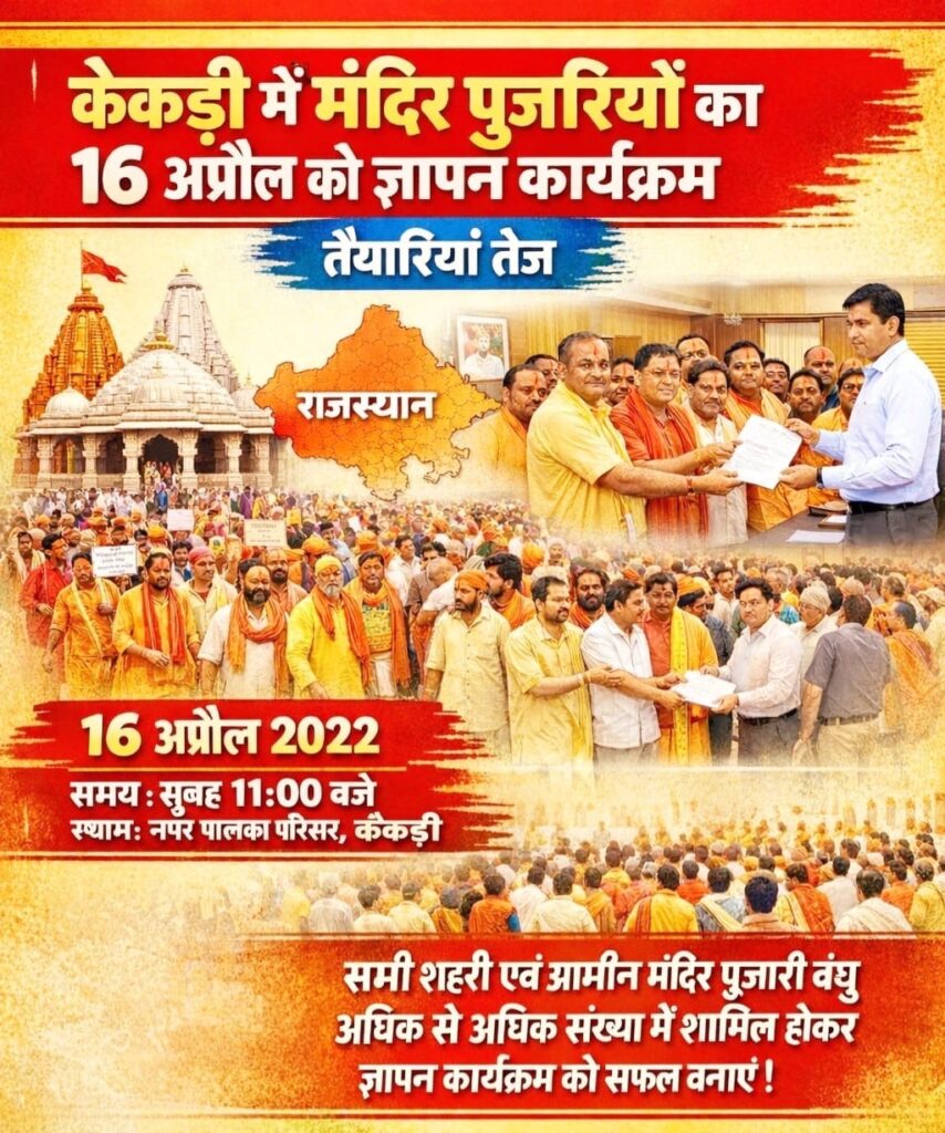 कार्यक्रम के अनुसार 16 अप्रैल को सुबह 11 बजे नगर पालिका केकड़ी परिसर में क्षेत्र के शहरी एवं ग्रामीण मंदिरों के सभी पुजारी बंधु एकत्रित होंगे। इसके पश्चात सामूहिक रूप से अतिरिक्त जिला कलेक्टर को ज्ञापन प्रस्तुत किया जाएगा।