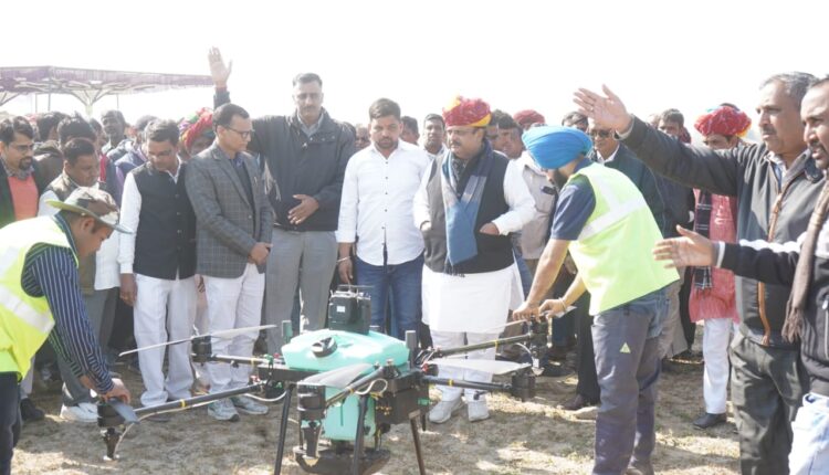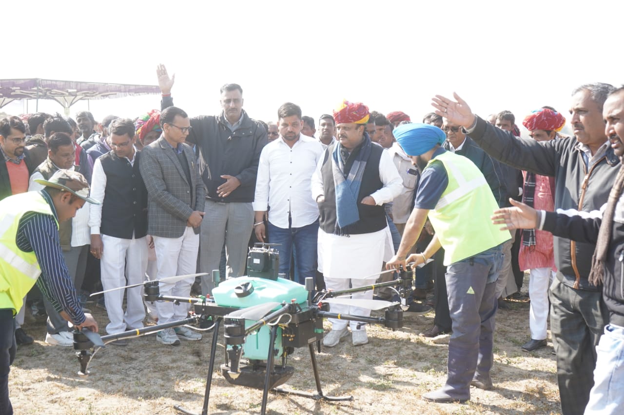 अजमेर । जिले में राष्ट्रीय कृषि विकास योजना के अंतर्गत ड्रोन के प्रदर्शन आयोजित कर नैनो यूरिया का छिड़काव किया गया। इसका शुभारम्भ पूर्व चिकित्सा मंत्री डॉ. रघु शर्मा ने किया। कृषि विभाग के संयुक्त निदेशक बुद्वि प्रकाश पारिक ने बताया कि सरवाड के ग्राम हिंगोनिया एवं बिलावटिया खेडा के 20 हेक्टर फसल कलस्टर क्षेत्र में ड्रोन के प्रदर्शन किए गए।इसके अंतर्गत कृषि कार्यो में ड्रोन द्वारा नैनो यूरिया के खड़ी फसल (गेहू इत्यादि ) में ड्रोन तकनीक द्वारा छिडकाव का संजीव प्रदर्शन किया गया। इसमे मुख्य अतिथि पूर्व चिकित्सा एवं स्वास्थ्य मंत्री एवं स्थानीय विधायक डॉ. रघु शर्मा तथा विशिष्ट अतिथि सागर शर्मा थे।