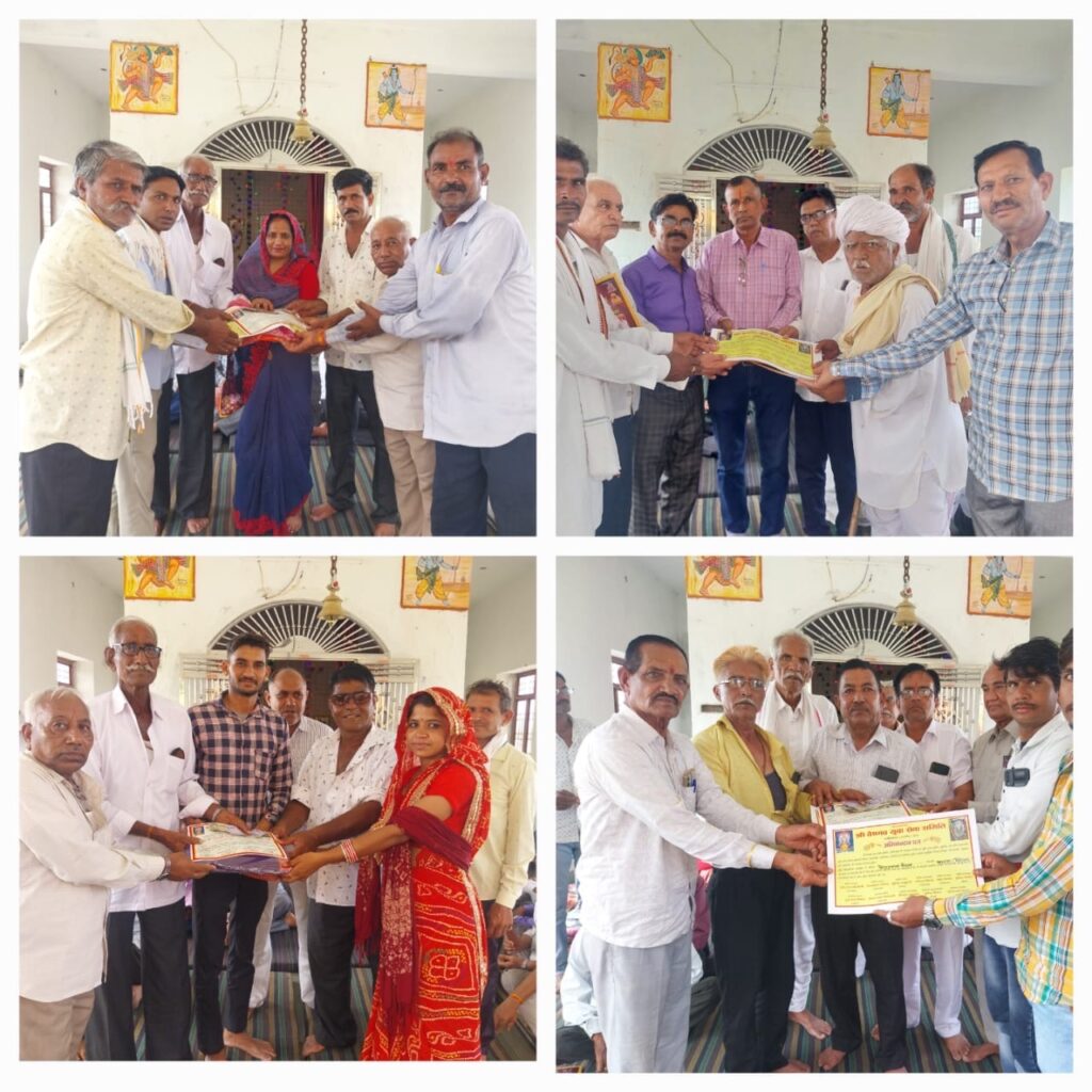 अजमेर। श्री वैष्णव समाज युवा सेवा समिति नसीराबाद के तत्वावधान में अक्षय तृतीया, 30 अप्रेल को आयोजित सामुहिक विवाह सम्मेलन में 22 जोड़ों का विवाह सानन्द सम्पन्न हुआ था। रविवार को सामुहिक विवाह सम्मेलन के गणेश जी की रसोई दिलवाडी स्थित बालाजी मंदिर पर रखी गई। जिसमें अजमेर जिले की समस्त समितियों के पदाधिकारियों के समाज बन्धुओं ने उपस्थित दर्ज कराई। कार्यक्रम में सामुहिक विवाह सम्मेलन के सभी जोड़ों को बुलाकर वैवाहिक प्रमाण पत्र के साथ कन्या दान में आई राशि भेंट की गई। साथ ही समिति द्बारा सामुहिक विवाह सम्मेलन के आय व्यय का हिसाब के पर्चे वितरित कर समाज बन्धुओं को हिसाब पेश किया गया। कार्यक्रम में श्याम सुन्दर वैष्णव हरिद्वार किशनगढ़, रामस्वरूप वैष्णव ठेकेदार किशनगढ़, केकड़ी समिति से अध्यक्ष सीताराम वैष्णव डाबर , पीसांगन समिति से अशोक वैष्णव, गुलाबपुरा समिति, सरवाड़ समिति,बहेड़ा समिति सहित कई समितियों के गणमान्य समाज बन्धुओं उपस्थित रहे। जिनका समिति की और अभिनन्दन पत्र देकर सम्मान किया गया। कार्यक्रम मे समिति पदाधिकारी राधेश्याम वैष्णव दिलवाडा, पुखराज वैष्णव सनोद, रामस्वरूप वैष्णव दिलवाडी, कैलाश वैष्णव नान्दला, बजरंग वैष्णव बहेड़ा, सत्यनारायण वैष्णव भटियाणी, मुकेश वैष्णव, सुरेन्द्र वैष्णव देरांठू, रामलाल वैष्णव लीडी, विशन वैष्णव, कैलाश वैष्णव श्री नगर, छोटू वैष्णव चाट, राधेश्याम, महावीर प्रसाद, नन्द किशोर वैष्णव दिलवाडी , धर्मराज वैष्णव लोहरवाड़ा, रामप्रसाद वैष्णव गादेरी, बालकिशन, अशोक वैष्णव दिलवाडा, सियाराम वैष्णव बहेड़ा, राधेश्याम वैष्णव श्री नगर सहित अन्य कई जागरूक कार्यकर्त्ता कार्यक्रम में उपस्थित थे।