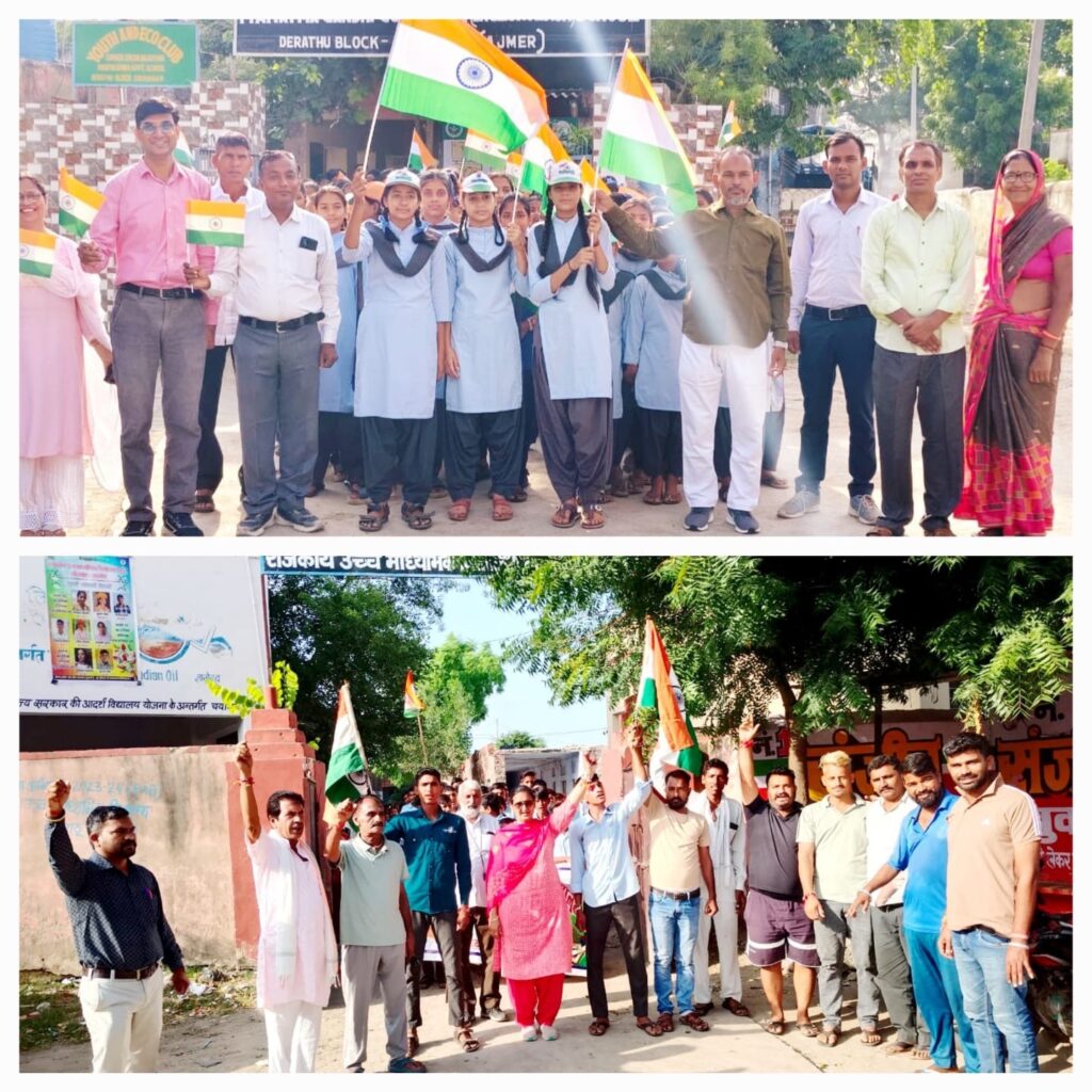 अजमेर। निदेशक माध्यमिक शिक्षा राजस्थान बीकानेर के आदेश अनुसार देरांठू के राजकीय उच्च माध्यमिक विद्यालय व महात्मा गांधी (अंग्रेजी माध्यम) राजकीय विद्यालय के छात्र छात्राओं द्वारा तिरंगा रैली का आयोजन किया गया। कार्यवाहक संस्था प्रधान सुषमा सोनी व महात्मा गांधी विधालय के प्रधानाचार्य अनिल गोयल ने बताया कि हर घर तिरंगा अभियान के अंतर्गत स्थानीय विद्यालयों द्वारा तिरंगा रैली का आयोजन किया गया। जिसमें छात्र छात्राओं एवं ग्राम वासियों द्वारा देश प्रेम और उमंग के साथ नारे लगाते हुए हर घर तिरंगा लहराएंगे ,घर-घर अलख जगाएंगे,वंदे मातरम,जय हिंद और भारत माता की जय के नारे लगाते हुए कस्बे के सभी मोहल्ले से होकर रैली निकाली। जिससे से कस्बे का वातावरण देशभक्ति पूर्ण हो गया और सब ने हर घर पर तिरंगा लगाने का प्रण लिया। इस अवसर पर राजकीय उच्च माध्यमिक विद्यालय से कार्यवाहक संस्था प्रधान सुषमा सोनी , सीमा जयंत , मोतीलाल, सरोज , नेहा टेपण , अंजना शर्मा, अशोक कुमार, बाबुलाल जाट , मोहम्मद इरफान, शहाबुद्दीन, गोरन्ती मीणा, मनोज कुमार वहीं महात्मा गांधी अंग्रेजी विधालय से प्रधानाचार्य अनिल गोयल ,अनिल जैन,केशर सिंह पवन कुमार महावर, सुल्तान खोकर, महावीर सिंह रावत, सुरेंद्र कुमार तोसावड़ा, आशीष दाधीच, दुर्गा प्रसाद मीणा , नियाज खान, अशोक कुमार मौर्य योगेश कुमार शर्मा, प्रार्थना अग्रवाल, आशा भाटिया, ज्योति कुमारी, कनिष्ठ लिपिक राम सिंह व स्थानीय विद्यालय के एस.एम.सी.अध्यक्ष शैतान कुम्हार,अरविंद चौधरी ,आनंद वैष्णव, मोहन प्रजापत के अलावा ग्राम के सम्मानित एवं गणमान्य नागरिक उपस्थित थे।