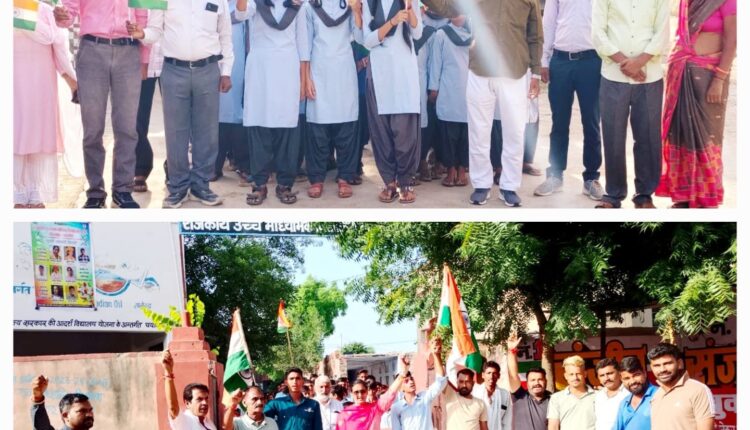 अजमेर। निदेशक माध्यमिक शिक्षा राजस्थान बीकानेर के आदेश अनुसार देरांठू के राजकीय उच्च माध्यमिक विद्यालय व महात्मा गांधी (अंग्रेजी माध्यम) राजकीय विद्यालय के छात्र छात्राओं द्वारा तिरंगा रैली का आयोजन किया गया। कार्यवाहक संस्था प्रधान सुषमा सोनी व महात्मा गांधी विधालय के प्रधानाचार्य अनिल गोयल ने बताया कि हर घर तिरंगा अभियान के अंतर्गत स्थानीय विद्यालयों द्वारा तिरंगा रैली का आयोजन किया गया। जिसमें छात्र छात्राओं एवं ग्राम वासियों द्वारा देश प्रेम और उमंग के साथ नारे लगाते हुए हर घर तिरंगा लहराएंगे ,घर-घर अलख जगाएंगे,वंदे मातरम,जय हिंद और भारत माता की जय के नारे लगाते हुए कस्बे के सभी मोहल्ले से होकर रैली निकाली। जिससे से कस्बे का वातावरण देशभक्ति पूर्ण हो गया और सब ने हर घर पर तिरंगा लगाने का प्रण लिया। इस अवसर पर राजकीय उच्च माध्यमिक विद्यालय से कार्यवाहक संस्था प्रधान सुषमा सोनी , सीमा जयंत , मोतीलाल, सरोज , नेहा टेपण , अंजना शर्मा, अशोक कुमार, बाबुलाल जाट , मोहम्मद इरफान, शहाबुद्दीन, गोरन्ती मीणा, मनोज कुमार वहीं महात्मा गांधी अंग्रेजी विधालय से प्रधानाचार्य अनिल गोयल ,अनिल जैन,केशर सिंह पवन कुमार महावर, सुल्तान खोकर, महावीर सिंह रावत, सुरेंद्र कुमार तोसावड़ा, आशीष दाधीच, दुर्गा प्रसाद मीणा , नियाज खान, अशोक कुमार मौर्य योगेश कुमार शर्मा, प्रार्थना अग्रवाल, आशा भाटिया, ज्योति कुमारी, कनिष्ठ लिपिक राम सिंह व स्थानीय विद्यालय के एस.एम.सी.अध्यक्ष शैतान कुम्हार,अरविंद चौधरी ,आनंद वैष्णव, मोहन प्रजापत के अलावा ग्राम के सम्मानित एवं गणमान्य नागरिक उपस्थित थे।