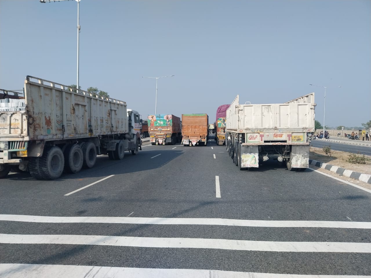 अजमेर । सरकार द्वारा ट्रक ड्राइवर के विरुद्ध दुर्घटना करने पर 10 लाख रुपए जुर्माना के साथ सजा का प्रावधान का नियम पारित करने आक्रोशित ट्रक ड्राइवरो ने जगह जगह हाईवे जाम कर सरकार के विरुद्ध प्रदर्शन कर रहे हैं । राष्ट्रीय हाईवे 48 के झडवासा , नसीराबाद के राताखेडा हाईवे के साथ जगह जगह जाम के समाचार मिले रहे हैं । वहीं ड्राईवरो द्बारा सभी आम रास्तों पर आडी तिरछी गाडियां खड़ी कर रास्ते बन्द कर देने से छोटे वाहन चालकों को भी परेशानियां उठानी पड़ रही है । वहीं जाम के कारण नसीराबाद ब्यावर रोड पर जाम लग गया है । नसीराबाद के अन्दर से होकर गुजरने वाले वाहनों के कारण नसीराबाद सिटी में भी गाडियां का जाम लग चुका है । वहीं हाईवे पर जाम की जानकारी मिलने पर पुलिस की बसें भी मौके पर आई , लेकिन ड्राईवरो की एकता देखकर व हालत को देखकर वापस चली गई । वहीं प्रशासन द्बारा शीघ्र निर्णय नहीं कराने पर हालत और भी बेकाबू हो सकते है । जिसमें आम जन को परेशानी उठानी पड़ेगी । वहीं अभी तक कोई भी प्रशासनिक पुलिस अधिकारी मौके पर नहीं पहुंचे थे ।