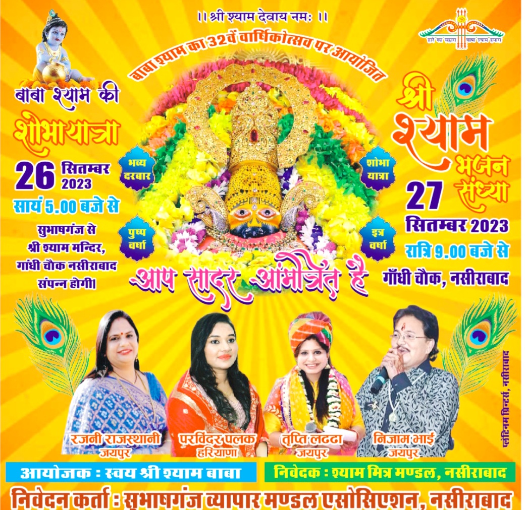 अजमेर । श्री श्याम मित्र मंडल नसीराबाद के तत्वाधान मे श्री श्याम प्रभु खाटू वाले के 32 वे वार्षिक उत्सव पर आयोजित कार्यक्रम श्री श्याम प्रभु खाटू वाले की भव्य शोभा यात्रा कल मंगलवार को सायं 5 बजे नसीराबाद के सुभाष गंज से सदर बाजार होते हुए गांधी चोक स्थित श्री श्याम मन्दिर पर पहुचेगी । जहाँ महाआरती के पश्चात प्रसाद वितरण होगा । वही 27 सितम्बर , बुधवार को विराट श्री श्याम भजन संध्या गांधी चौक नसीराबाद पर रात्रि 9 बजे से आयोजित होगी । जिसमे भजन गायक रजनी राजस्थानी जयपुर , परविंदर पलक हरियाणा , तृप्ति लढढा जयपुर व निजाम भाई जयपुर श्याम भजनो की शानदार प्रस्तुति देगे । श्री श्याम मित्र मण्डल ने सभी श्याम भक्तों से अधिक से अधिक संख्या मे श्याम भजनो मे पधार कर श्री श्याम प्रभु खाटू के भजनो का रसपान करने की अपील की है ।
