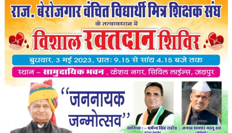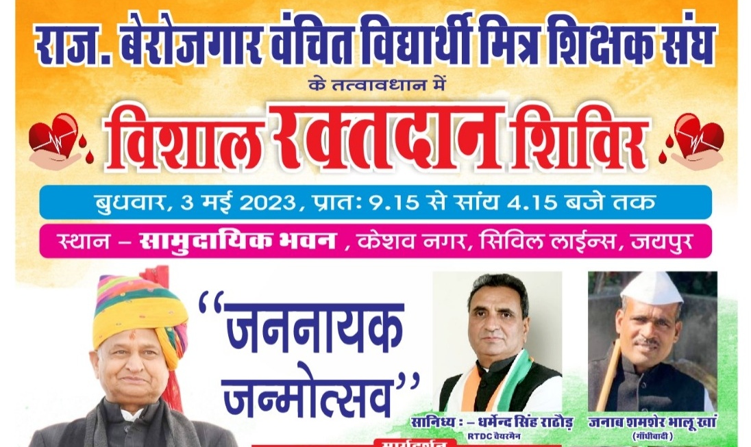 सीएम के जन्मदिवस पर इस बार राजस्थान बेरोजगार वंचित विद्यार्थी की ओर से विशाल रक्तदान शिविर का आयोजन 3 मई को सिविल लाइंस स्थित, केशव नगर मे सामुदायिक भवन पर प्रात: 9.15 से सांय 4.15 तक आयोजित किया जायेगा जिसमें पूरे प्रदेश से बेरोजगार विधार्थी मित्र बड़ी संख्या में भाग लेंगे। जननायक के जन्मोत्सव पर शिविर के सफल आयोजन को लेकर तैयारियां युद्ध स्तर पर चल रही हैं। प्रदेश कार्यकारिणी के शीर्ष नेतृत्व ने बताया कि जयपुर में रक्तदान शिविर का आयोजन किया जायेगा जिसके फलस्वरूप प्रदेश कार्यकारिणी व सक्रिय कार्यकर्ता 2 मई को रक्तदान दिवस से एक दिन पूर्व जाकर तैयारियों का जायजा लेंगे ताकि इस रक्तदान शिविर को ऐतिहासिक बनाया जा सके। जिसके लिए प्रदेेश भर के बेरोजगार विधार्थी मित्रों को अधिक से अधिक संख्या में भाग लेने का आह्वान किया गया है l