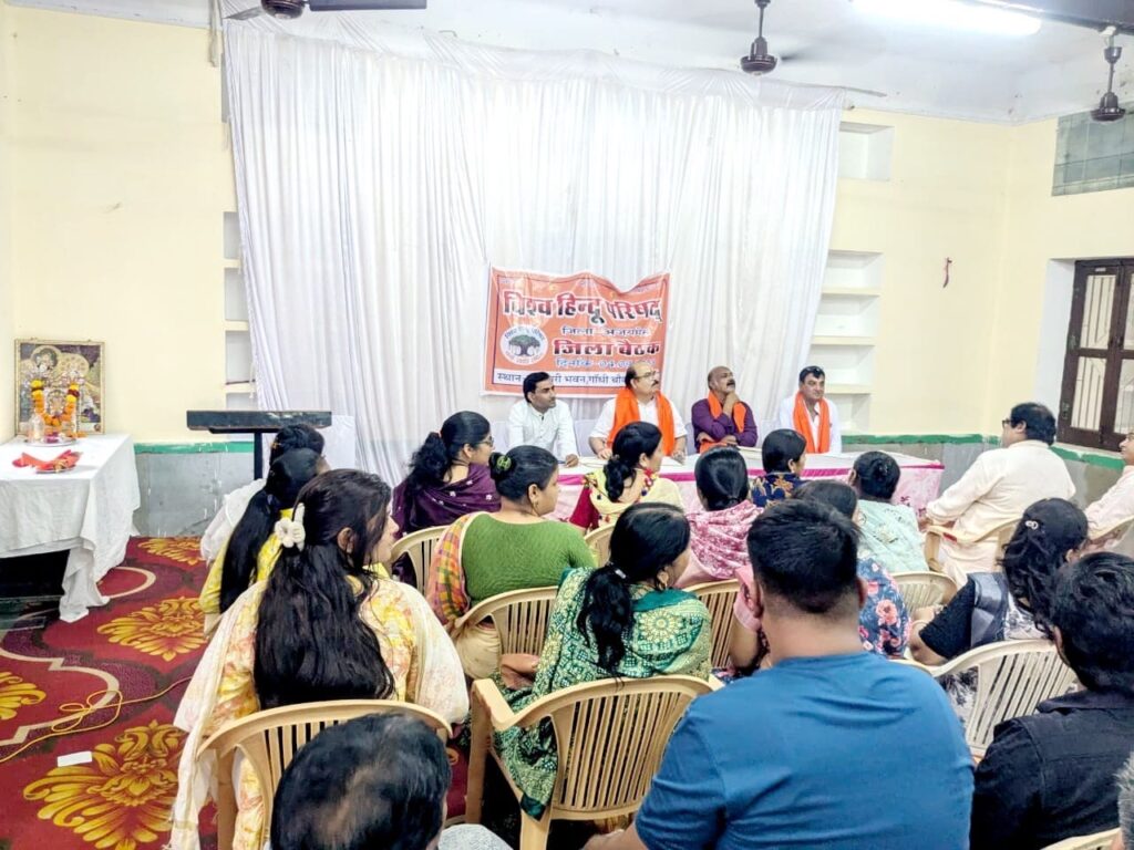 जिला बैठक में विहिप के प्रांत मंत्री कौशल गौड , विभाग सगंठन मंत्री बनवारी लाल, विभाग मंत्री श्याम सोनी, जिला मंत्री गोविन्द शर्मा , मंत्री ललित राठी के मार्गदर्शन में बैठक आयोजित की गई।